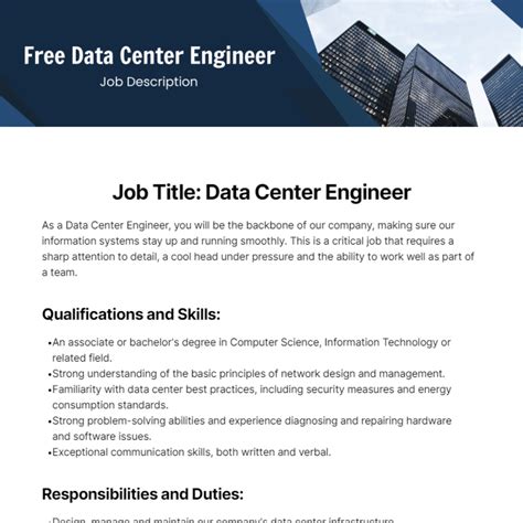 Hey everyone! Let’s dive deep into what it means to be a Data Center Engineer . You guys are the backbone of the digital world, the wizards behind the curtain making sure all our data is safe, sound, and accessible 24 7 . If you’re looking to get into this super critical field, or maybe you’re already in it and want to see how your role stacks up, you’ve come to the right place. We’re going to break down everything about the data center engineer job description, from the nitty-gritty technical skills to the everyday responsibilities that keep the digital gears turning. Think of this as your ultimate guide, packed with insights and ready to make you a data center guru. So grab a coffee, settle in, and let’s get started on unraveling the mysteries and the magic of the data center engineer role!