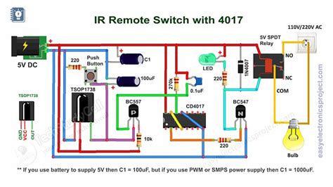 • Relay Control: Use the output of the IC 4017 to drive a relay, which can then be used to control higher voltage devices like lights or appliances. This turns your IR sensor switch into a remote control for your home automation projects.