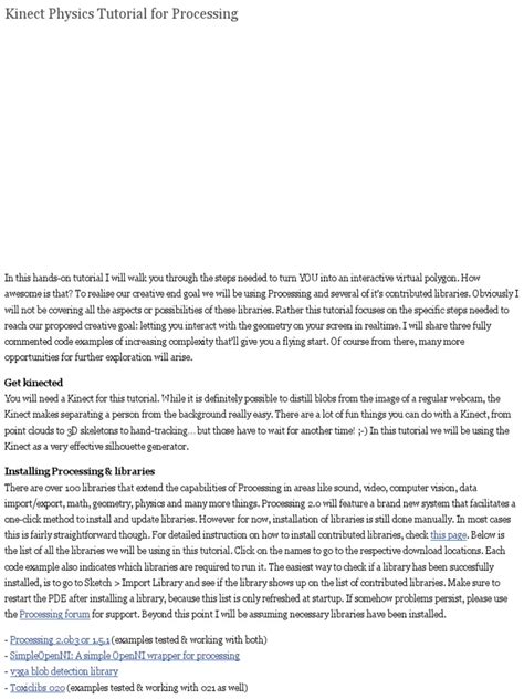 • Integrate with other libraries: Processing has a vast ecosystem of libraries that you can use to add even more functionality to your Kinect projects. For example, you could use the minim library to add sound effects or the toxiclibs library to add advanced physics simulations.