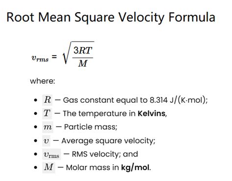 This process ensures that the faster molecules have a greater impact on the final average. Mathematically, the RMS velocity ((v_{rms})) is given by the formula: