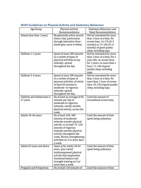 Alright, let’s get down to business, guys. For adults (aged 18-64 years) and adolescents (aged 13-17 years), the WHO’s 2020 guidelines lay out some key targets for aerobic physical activity . The big one here is aiming for at least 150-300 minutes of moderate-intensity aerobic activity per week . What does moderate-intensity mean, you ask? Think of it as activities that get your heart rate up and make you breathe a bit harder, but you can still hold a conversation. Examples include brisk walking, cycling on level ground, dancing, or water aerobics. Seriously, guys, these are things most of us can easily incorporate into our routines. Now, if you’re feeling more ambitious or short on time, you can also aim for at least 75-150 minutes of vigorous-intensity aerobic activity per week , or an equivalent combination of both. Vigorous-intensity means activities that make your heart beat fast and breathing difficult, like running, swimming laps, or playing competitive sports. You’ll know you’re in the zone when you can only speak a few words at a time. But here’s the crucial part that often gets overlooked: the WHO also strongly recommends muscle-strengthening activities at moderate or greater intensity at least two days a week . This means exercises that work your major muscle groups – your legs, hips, back, abdomen, chest, shoulders, and arms. We’re talking about things like lifting weights, using resistance bands, doing bodyweight exercises like push-ups and squats, or even strenuous gardening. Why is this so important? Because building muscle isn’t just about looking good; it’s vital for maintaining mobility, boosting your metabolism, and preventing falls, especially as we age. The guidelines emphasize that sedentary behavior should be limited. This is a biggie in today’s world where many of us spend hours sitting at desks or in front of screens. The advice is to replace sedentary time with physical activity of any intensity. So, even short bursts of activity, like standing up and stretching or taking a quick walk, can make a difference. For those who can’t meet the recommended levels, being as physically active as their abilities and health allow is still incredibly beneficial. It’s all about progress, not perfection, and the WHO is all about inclusivity. They really stress that more is better – if you can do more than the minimum recommended, you’ll likely gain even more health benefits. So, don’t just stop at 150 minutes if you’re feeling good; keep going!